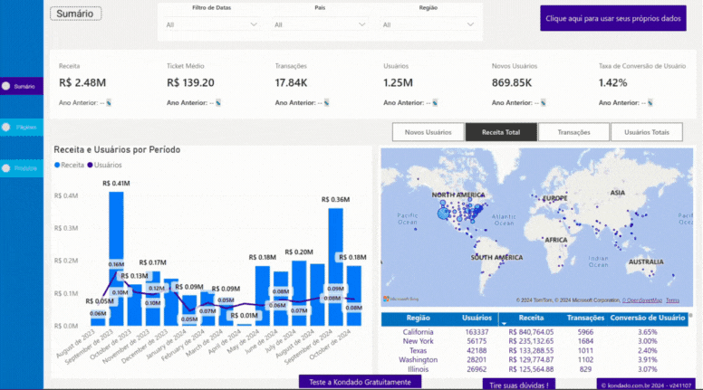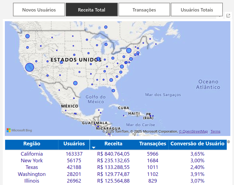 Um gráfico de mapas permite visualizar a origem geográfica da distribuição de indicadores como “Novos usuários”, “Receita total”, “Transações” e “Usuários totais”.