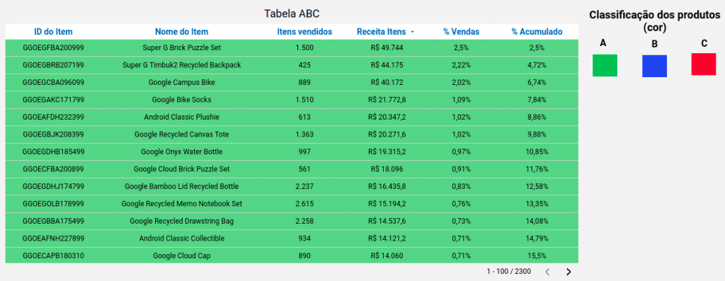 Tabela que exibe as informações da Curva ABC, indicando o percentual de participação dos itens mais relevantes (Grupo A), intermediários (Grupo B) e de menor impacto (Grupo C) no faturamento total, juntamente com sua respectiva receita.