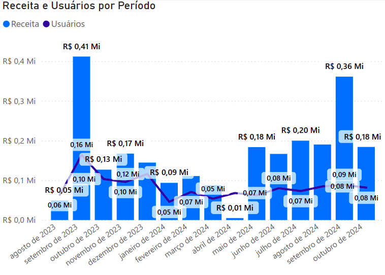 Este gráfico de eixo duplo relaciona a receita gerada com o número de usuários ao longo do tempo. É ideal para visualizar tendências e sazonalidades nas vendas.