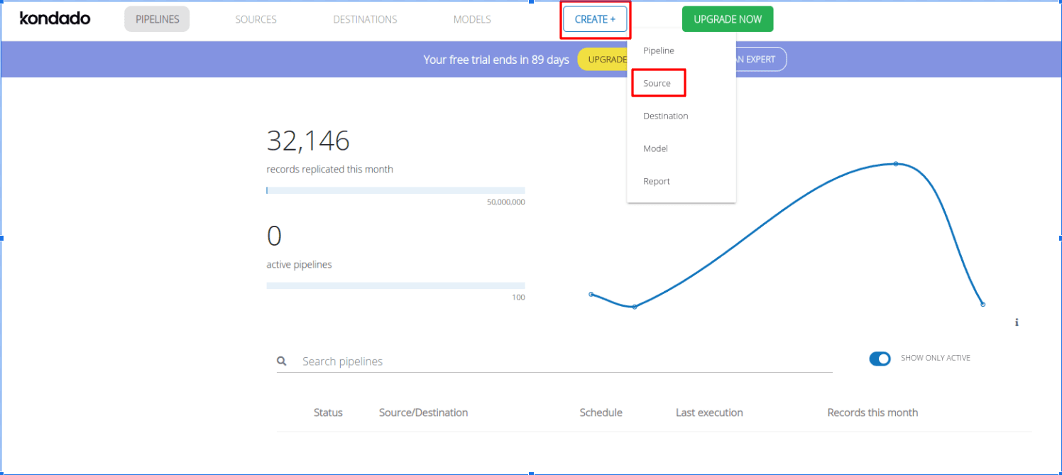 After logging in, click on "CREATE +" and then select "SOURCE":