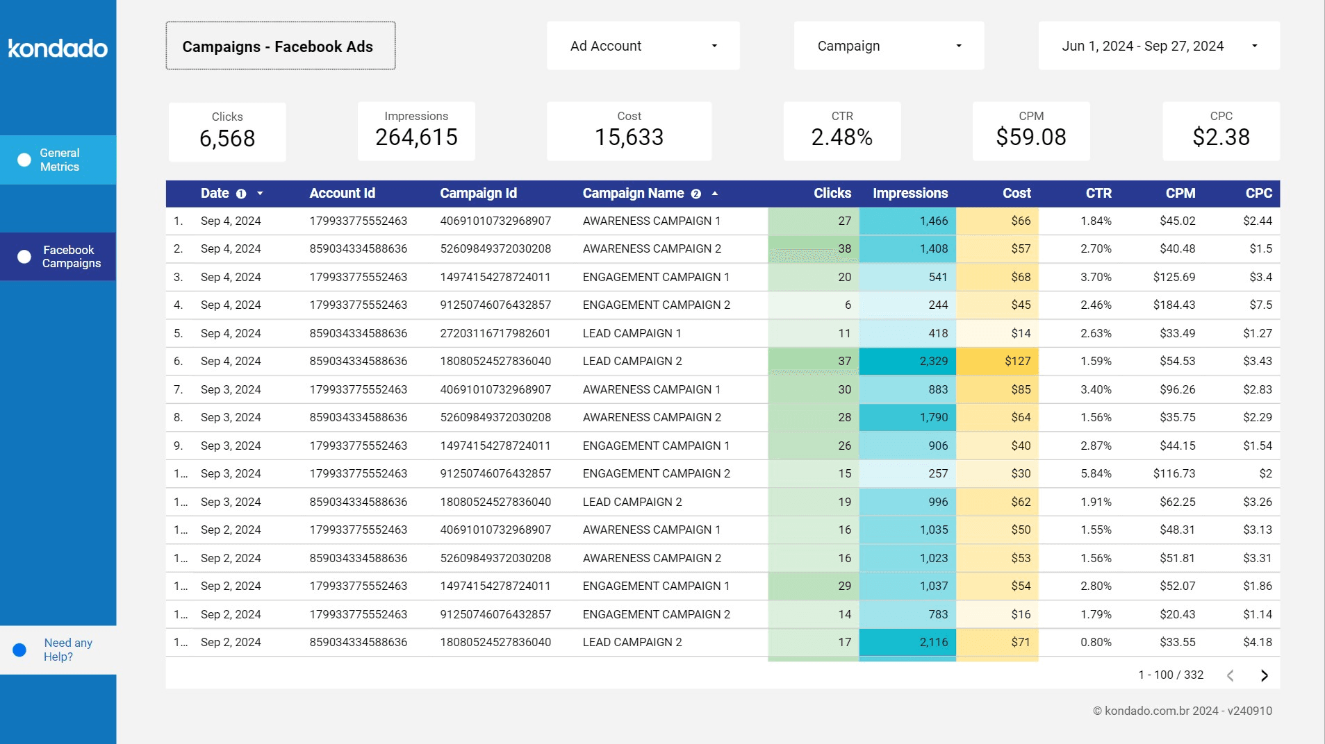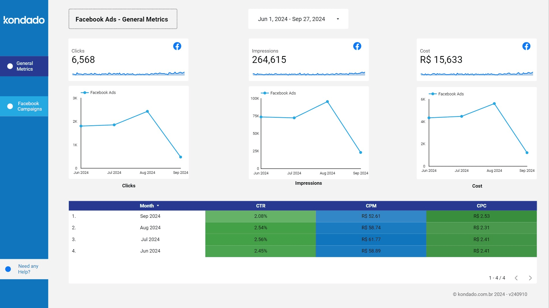This page provides an overview of the key information from Facebook Ads, making it easier to understand metrics such as clicks, cost, impressions, CTR, and others.