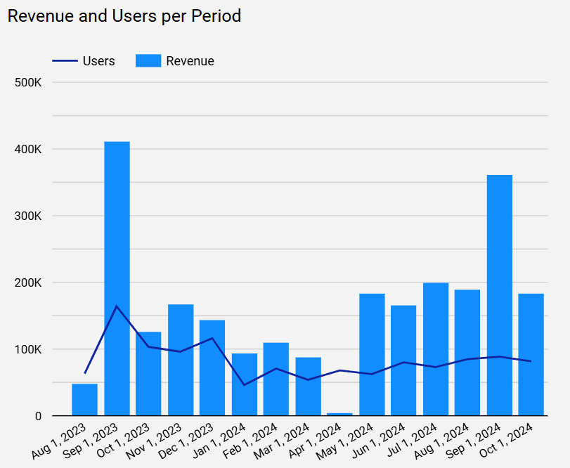 Revenue and Users by Period Chart: A dual-axis visualization chart that allows analysis of the relationship between revenue and user volume for each period.