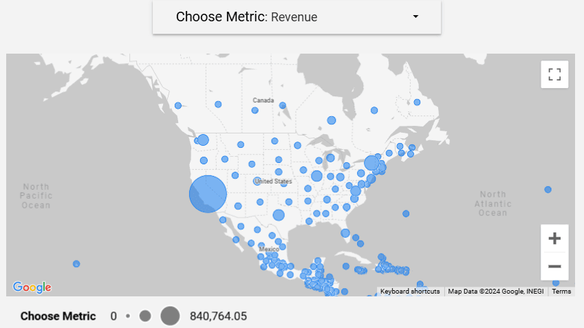 Map Chart: A map chart that allows visualization of selected indicators, such as "New Users," "Total Revenue," "Transactions," and "Total Users," by region. The variation in circle sizes on the map reflects the relative values of each parameter, facilitating geographic analysis of the chosen data.