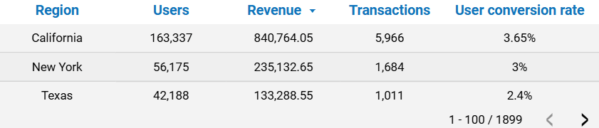 - Data Source: Table: “ga4_summary”; Columns: “region”, “totalusers”, “totalrevenue”, “transactions”.