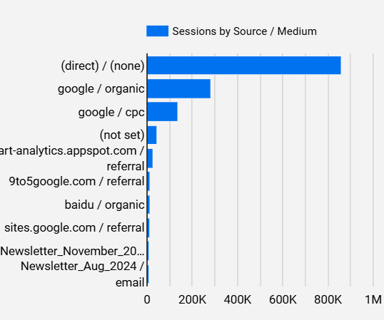 Sessions by Source/Medium Chart: Understand which traffic sources drive the most visits by viewing session counts, and optimize your acquisition strategies accordingly.