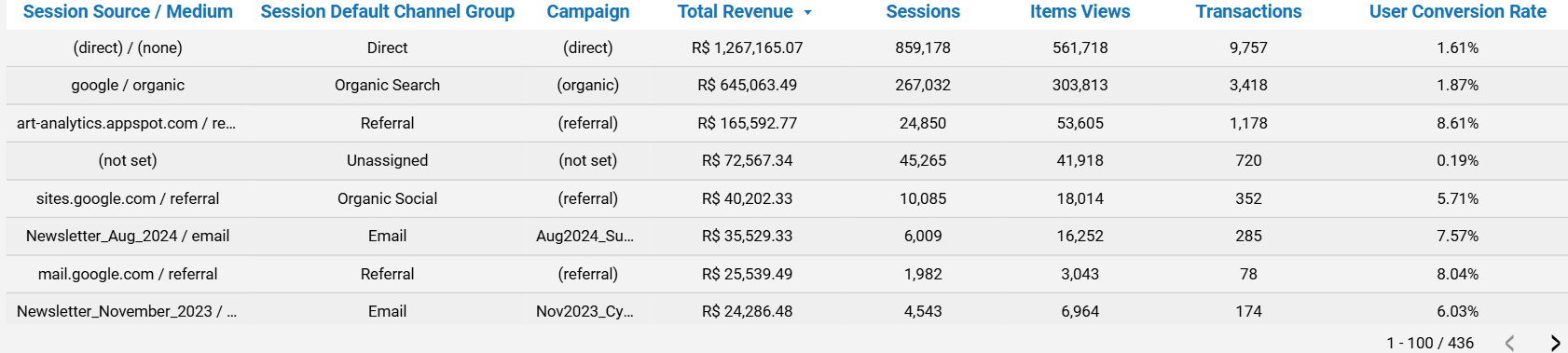 - Data Source: Table: “ga4_page”; Columns: “sessiondefaultchannelgroup”, “sessioncampaignname”, “totalrevenue”, “sessions”, “itemviewevents”, “transactions”, “totalusers”.