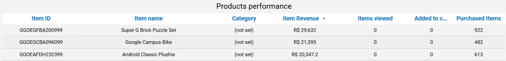- Data Source: Table: “ga4_products”; Fields: “itemid”, “itemname”, “itemcategory”, “itemrevenue”, “itemsviewed”, “itemsaddedtocart”, “itemspurchased”.