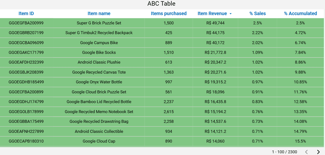 ABC Curve Table: A table that presents ABC curve information, showing the percentage representation of each item’s sales revenue. Additionally, it displays the corresponding revenue. All information adjusts according to the selected filters.