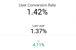 - Note: This is calculated as the percentage of "transactions" divided by "totalusers". In addition to displaying the user conversion rate for the period, there is a comparison (percentage and quantitative) with the same period in the previous year.