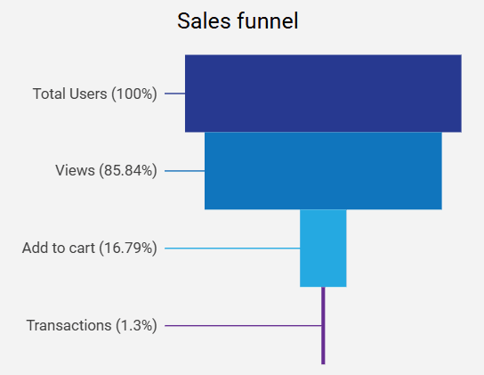 Sales Funnel Chart: Understand your user conversions with the Sales Funnel Chart. View each stage of the journey: Total Users, Items Viewed, Items Added to Cart, and Transactions, with absolute numbers and percentages of the total.