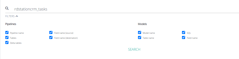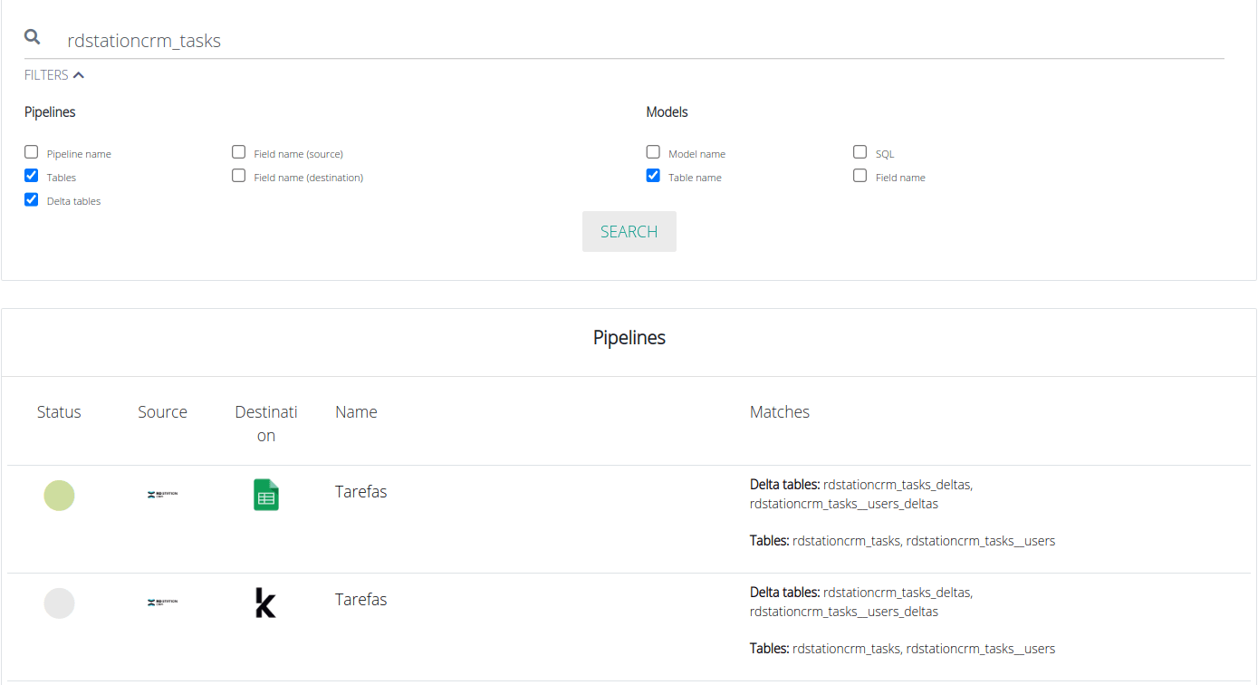 Now, imagine that you are managing your data destination and come across a table called "rdstationcrm_tasks". You then decide to find out where it comes from, its frequency, and how it is configured. Since you already know it is a table, you are not interested in columns with this name.