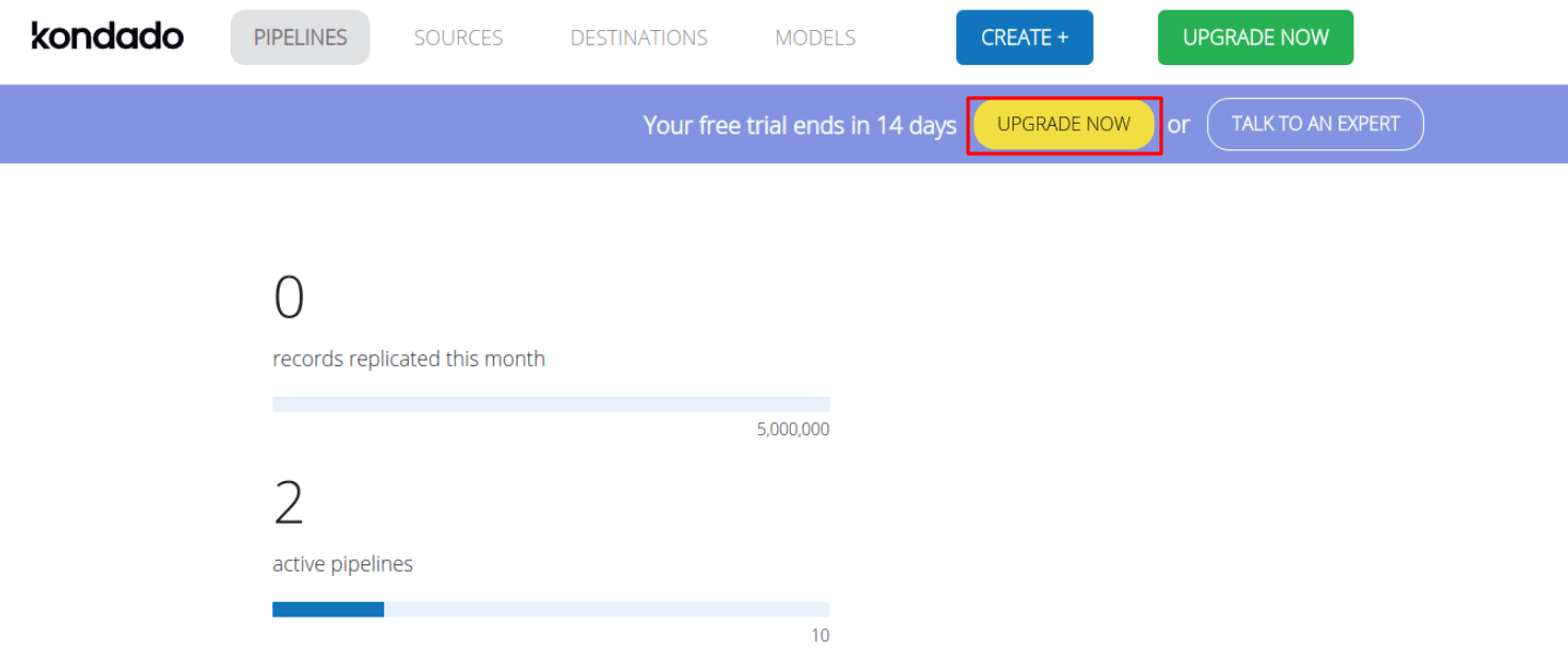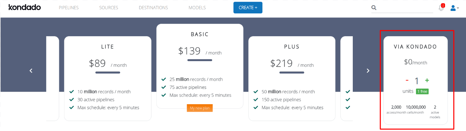 All Kondado plans are characterized by only two types of limits: the number of active pipelines and the number of records successfully inserted into the data destination. The number of sources, users, and models registered on the platform is unlimited.