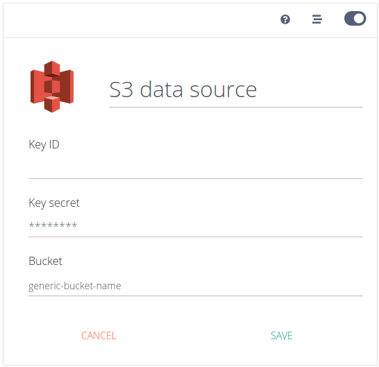 - Access our platform and click on CREATE + > Source > select the S3 data source