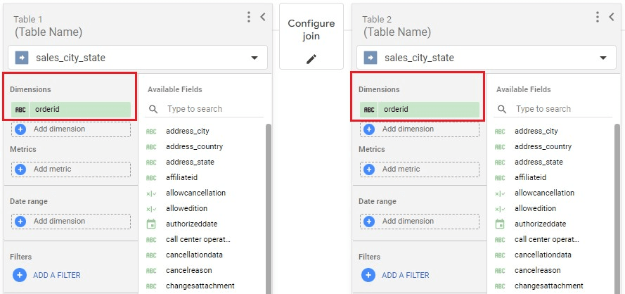 5 - In both tables, under “Dimensions,” first select the key to be used between the tables; in this case, the key is “orderid”;