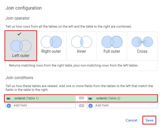 7 - In “Join Operator,” select the “Left outer” option, and under “Join Conditions,” select the dimension key for both tables and click “Save”;