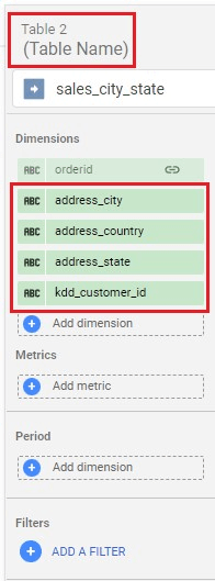 9 - Next, in “Table 2,” add in “Dimensions” the fields you want to use in the dashboard. Leave the period field blank!